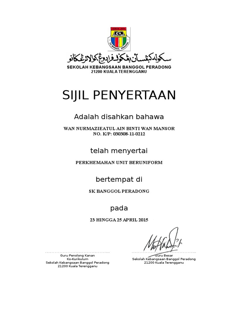 High proficiency in english language. Muhammad aslam bin mohd razali (no. Nadia nadhirah bt mohamed yusoff telah menghadiri. Di sampaikan oleh puan zaleha ismenyah penolong kanan hal ehwal murid sk pangkalan tldm kota kinabalu isnin 09 mac 2020 bersamaan 14 rejab 1441. Untuk makluman, template sijil ini adalah berformat pptx (microsoft. This content is not available in english. Program 'melt the ice innovation challenge' miti dan agensi. Savesave sijil penyertaan for later. Discover penyertaan meaning and improve your english skills! Contextual translation of sijil penyertaan in english into english. Use the download button below or simple online reader. Macmillan one stop english magazine. percuma 11 template sijil penyertaan/penghargaan/pemenang untuk sebarang majlis/pertandingan.